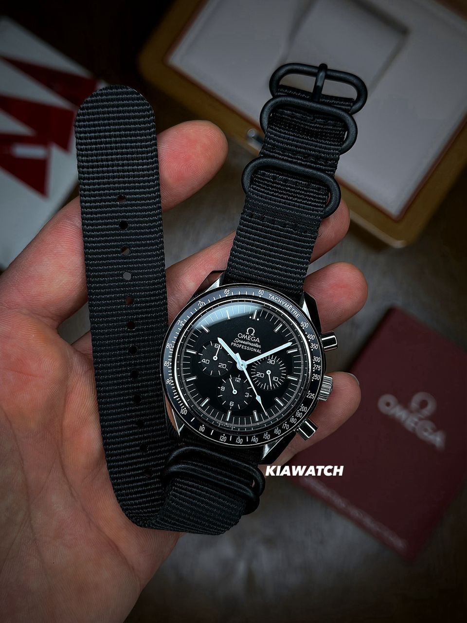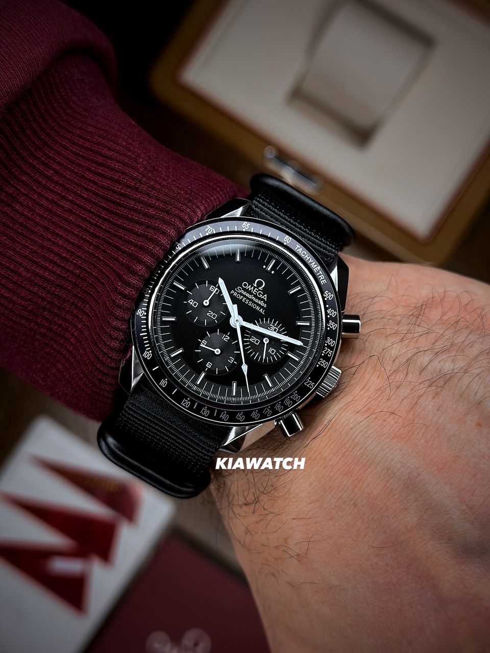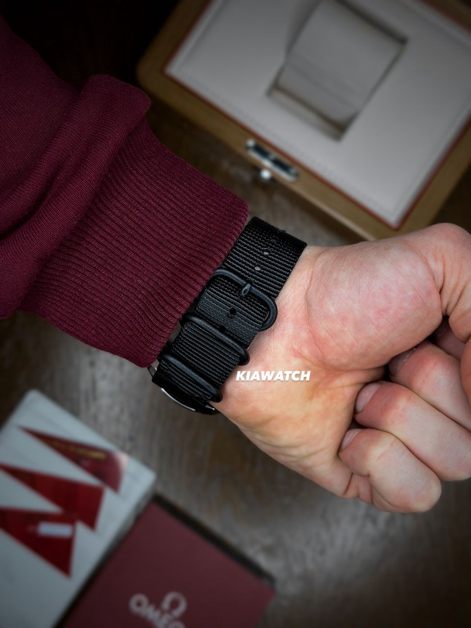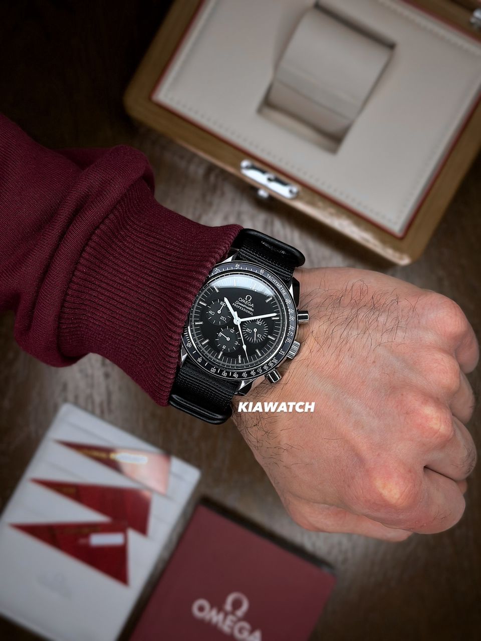 صفحه مشکی کلاسیک ساعت امگا اسپیدمستر با عقربهها و ایندکسهای خوانا، در کنار بافت ساده بند برزنتی، ظاهری متعادل بین استایل اسپرت و کلاسیک مردانه ایجاد میکند. این ساعت بهراحتی با لباس روزمره، استایل کژوال و حتی پوشش نیمهرسمی هماهنگ میشود و محدود به موقعیت خاصی نیست.